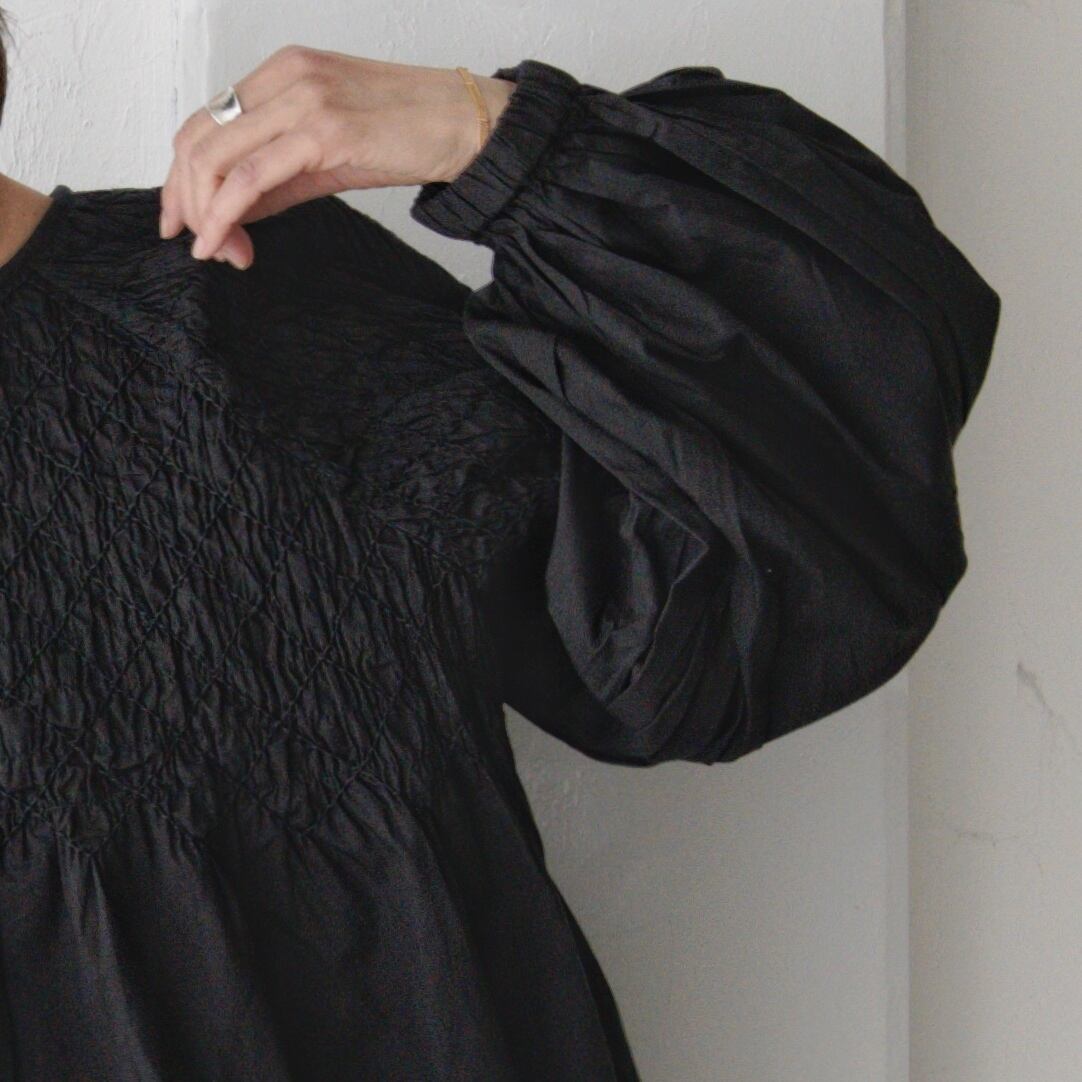 立体的なスモッキングや、ふんわりとしたボリュームスリーブの美しさを引き立てます。