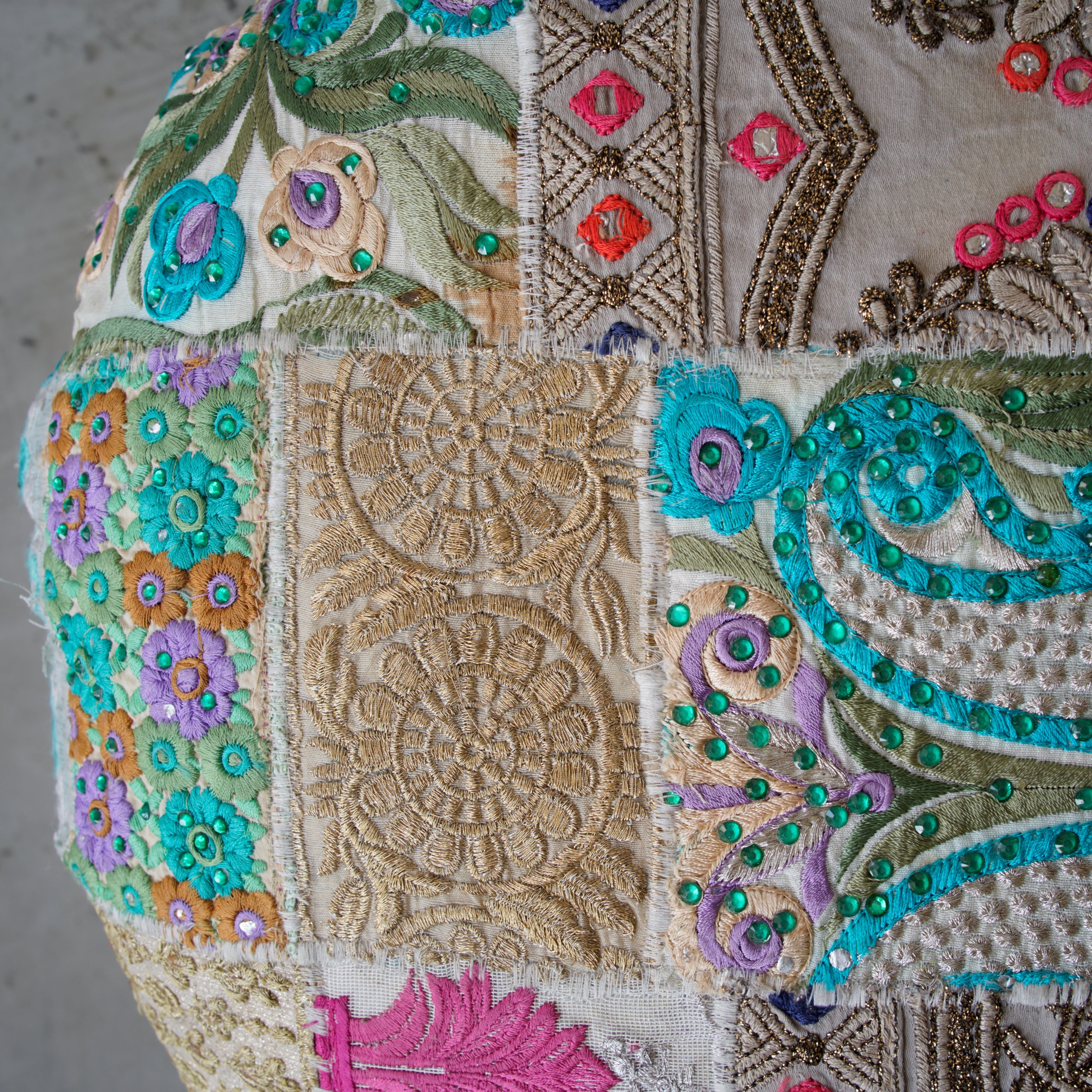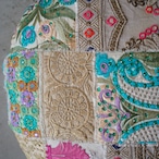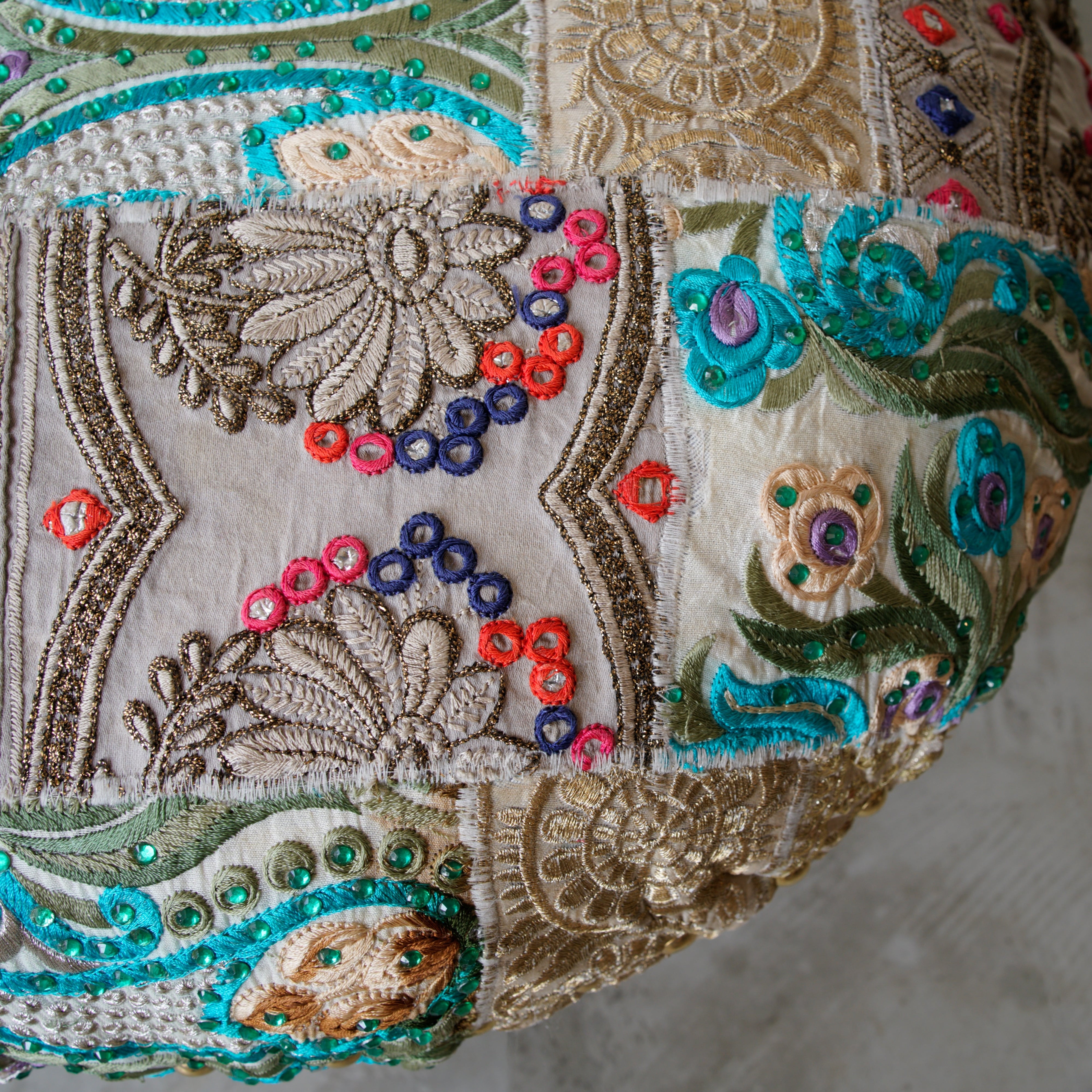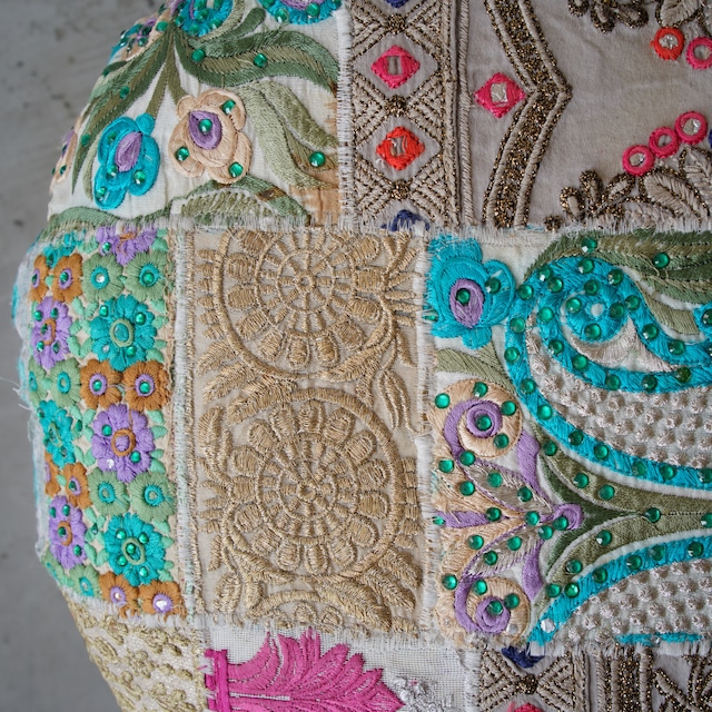 色とりどりの布や刺繍、ビーズやスパンコールがパッチワークのように重なり合い、手仕事ならではの豊かな表情を楽しめます。