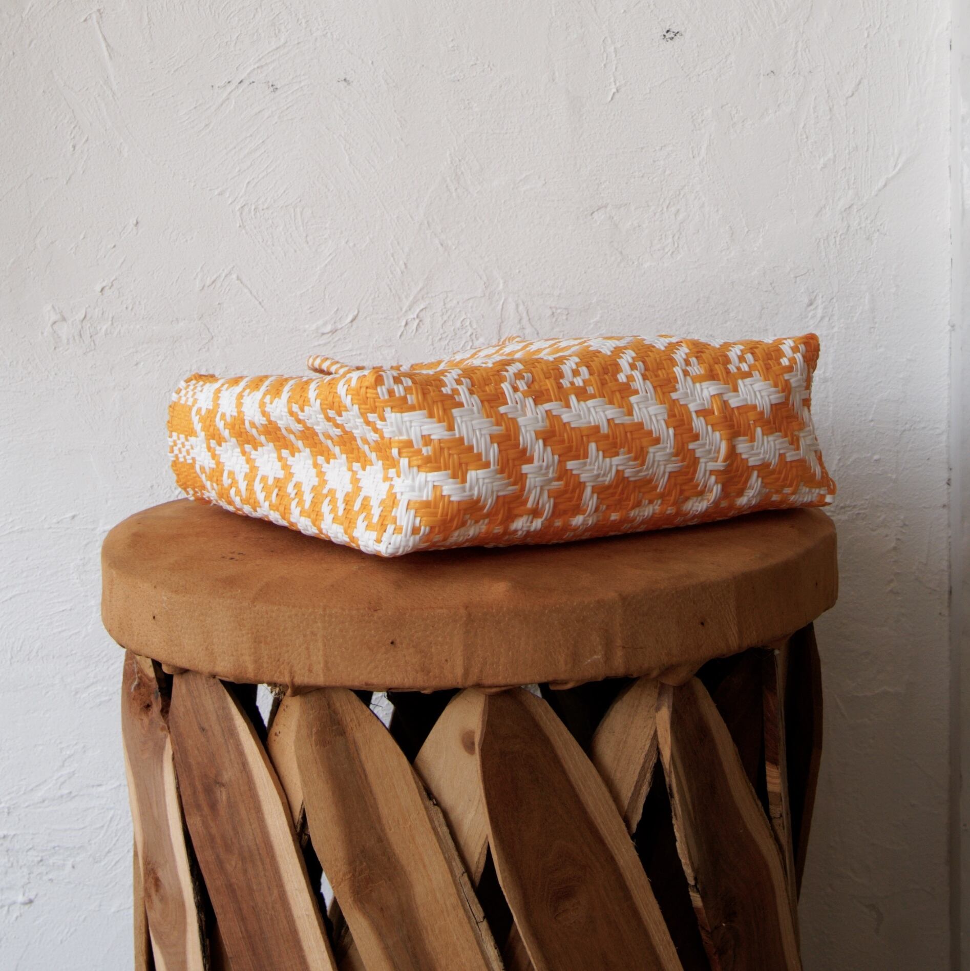 リサイクルプラスチックを使い、ひとつひとつ手作業で編まれています。