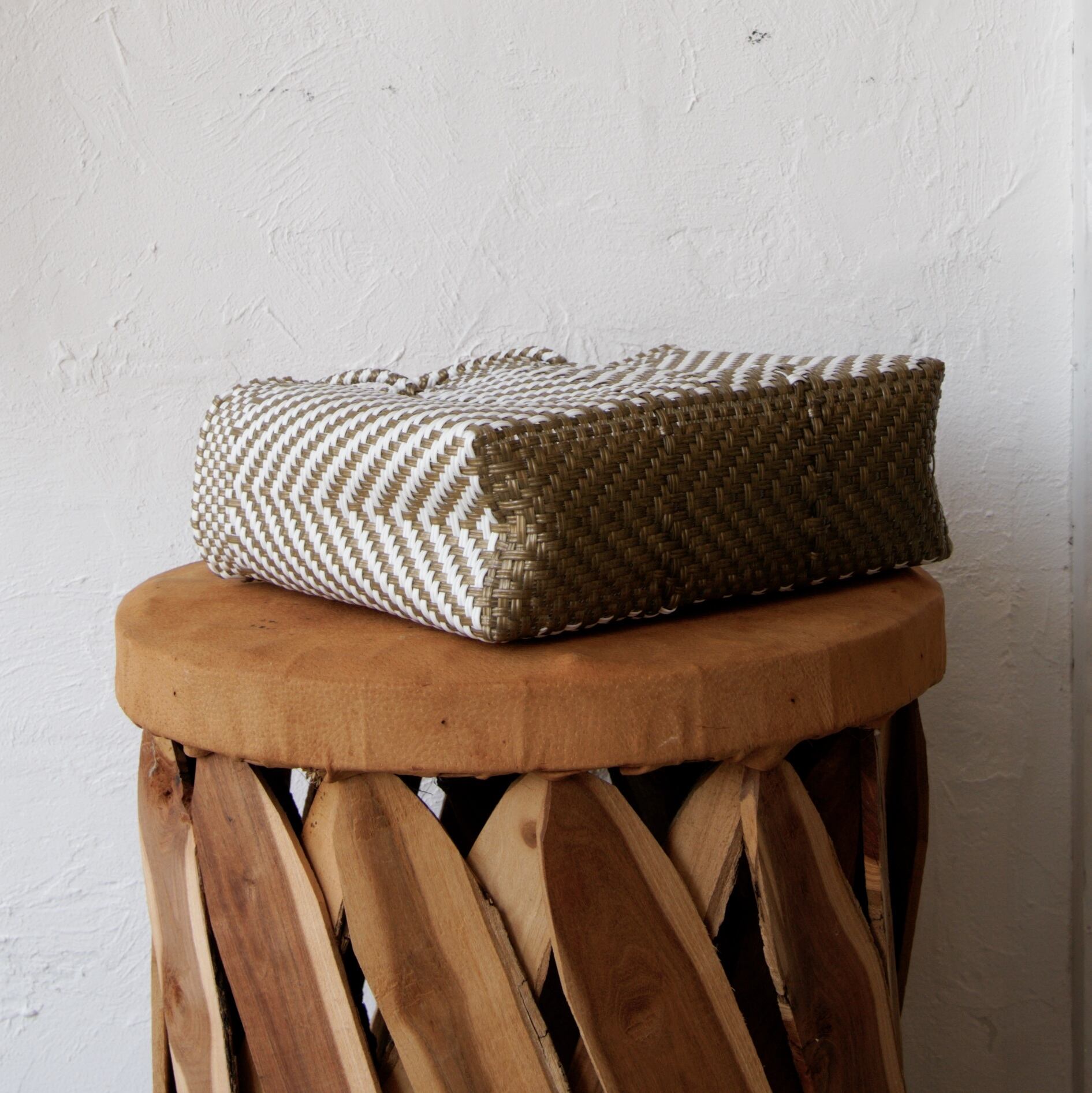 リサイクルプラスチックを使い、ひとつひとつ手作業で編まれています。