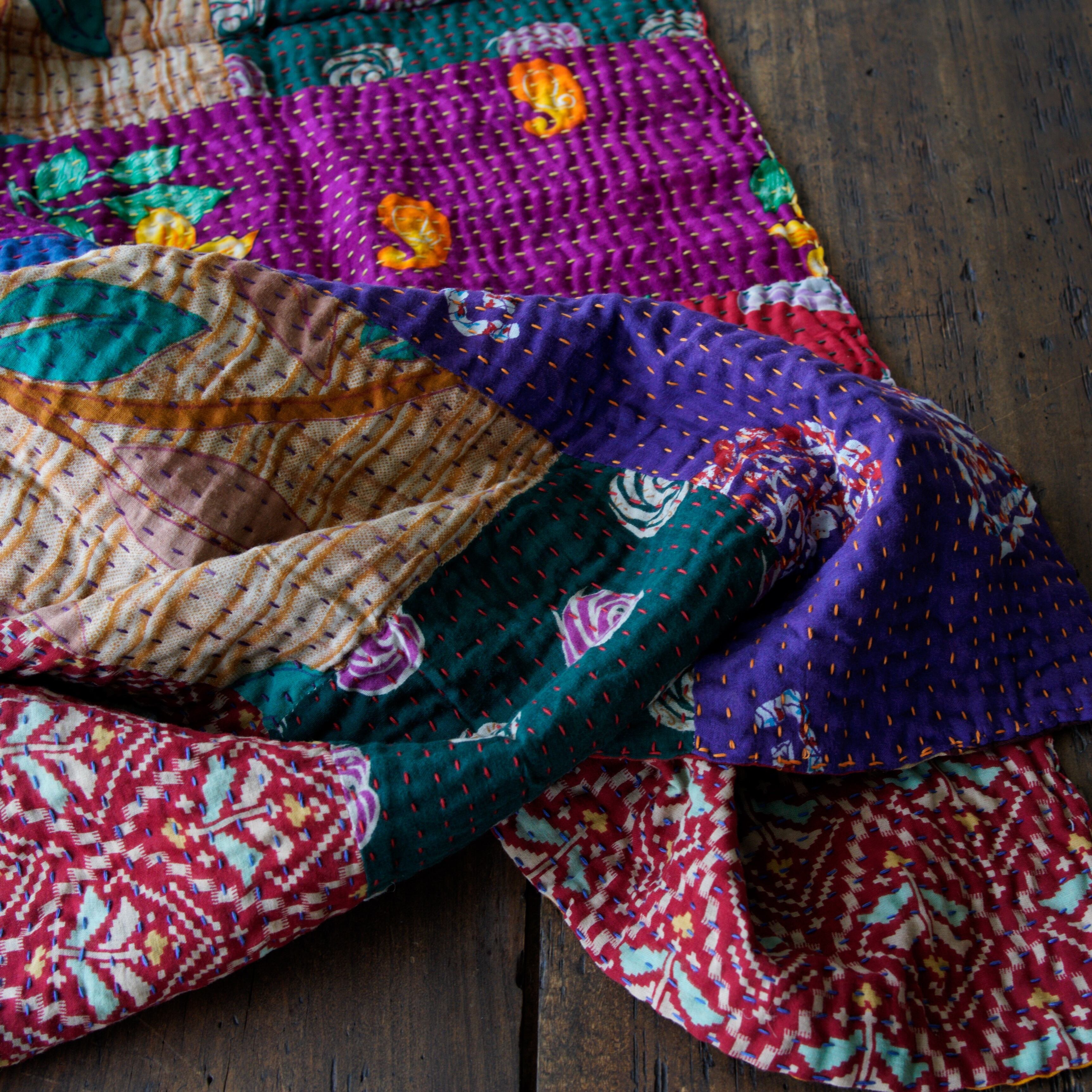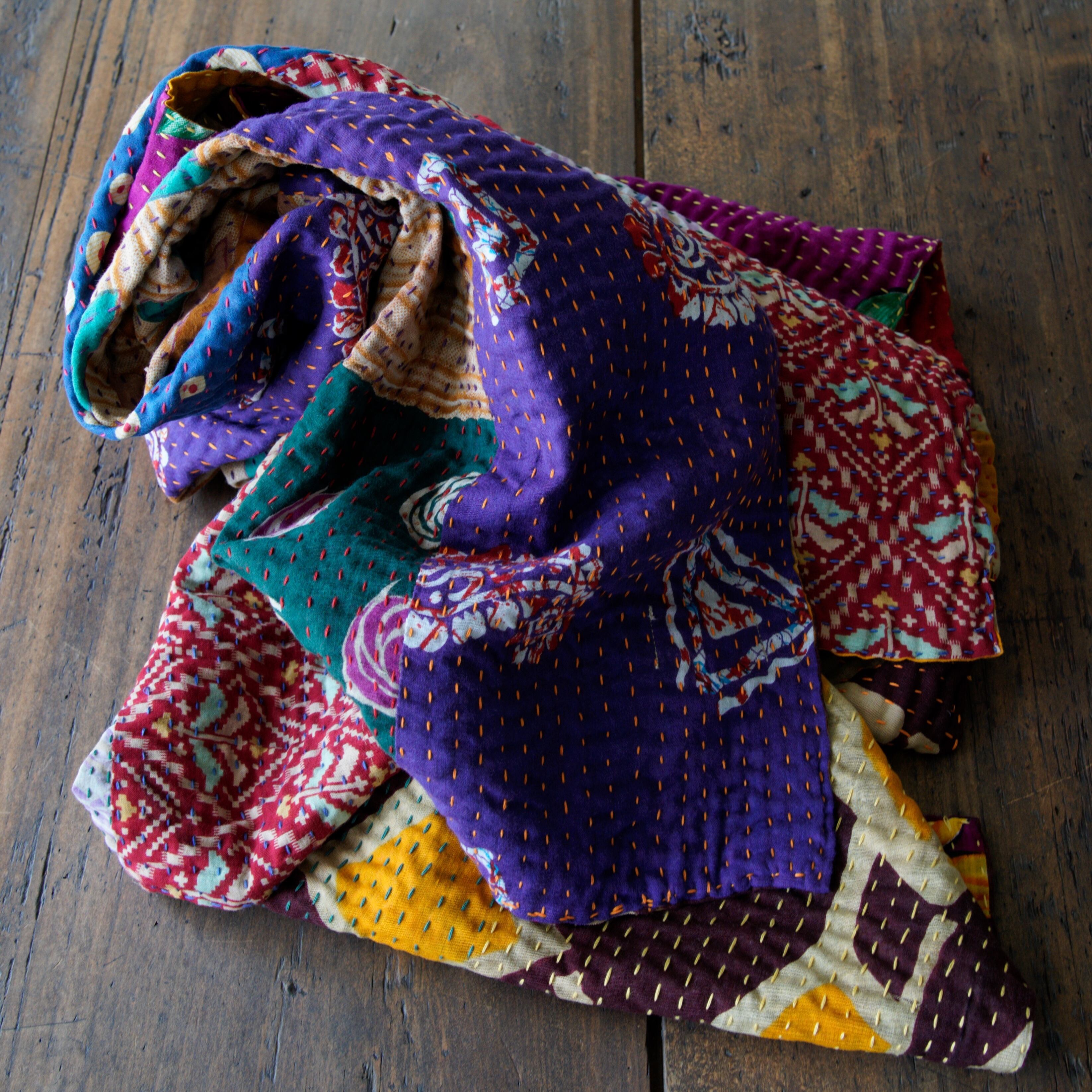 リサイクルサリーをランダムに使った、世界に1枚のパッチワーク調マルチカバー。