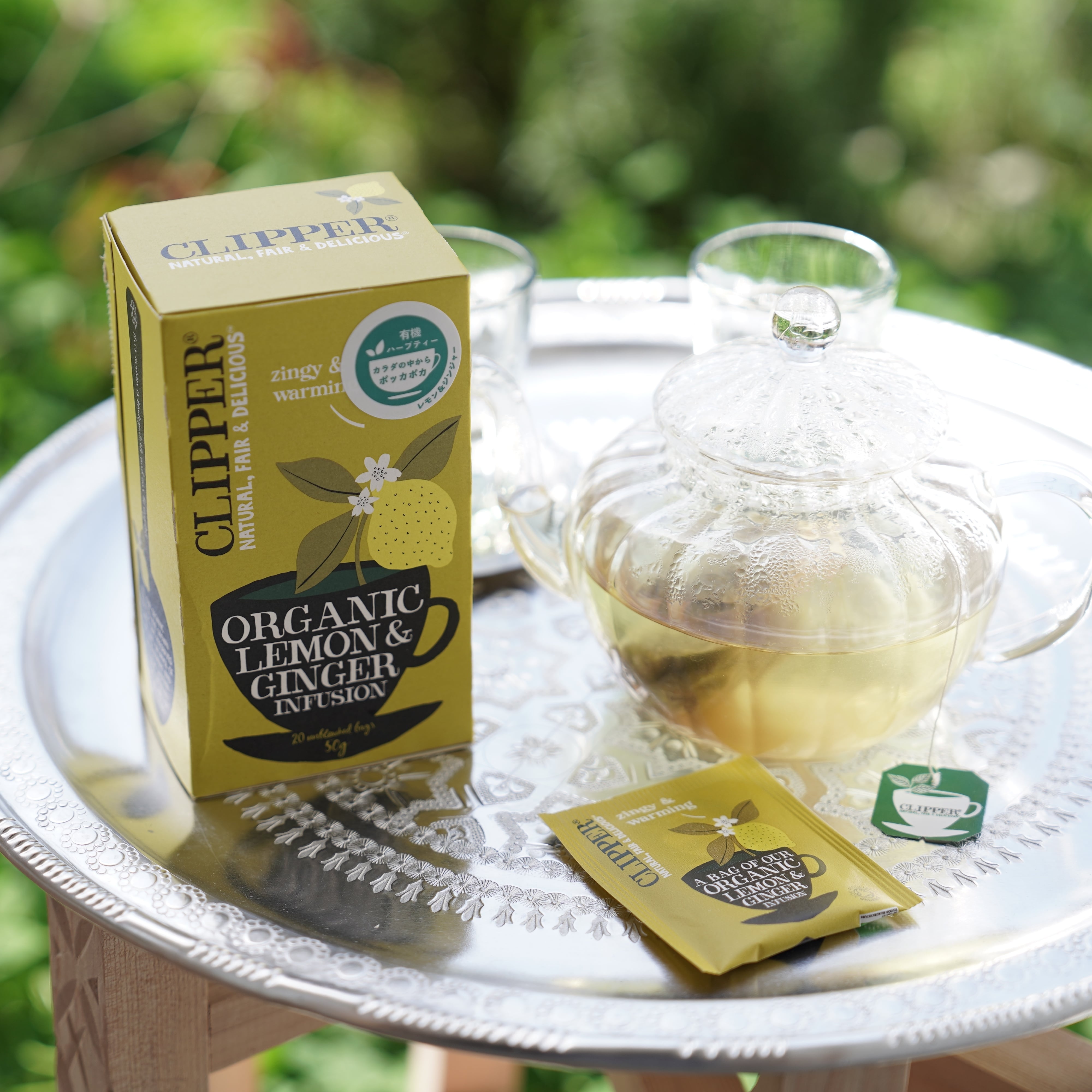 ピリッとしたジンジャーとレモングラス、リコリス、レモンの皮をブレンドしたオーガニックハーブティー。