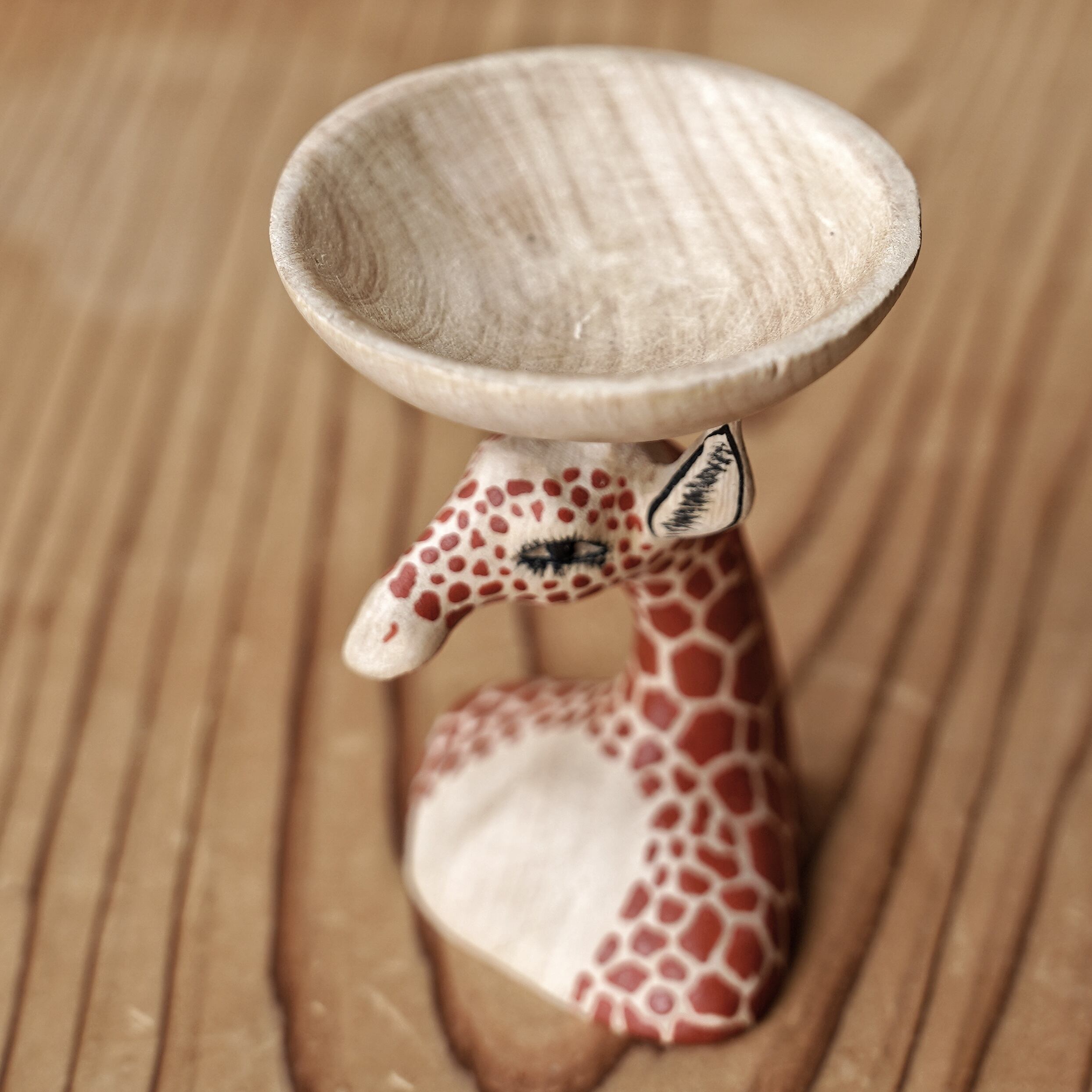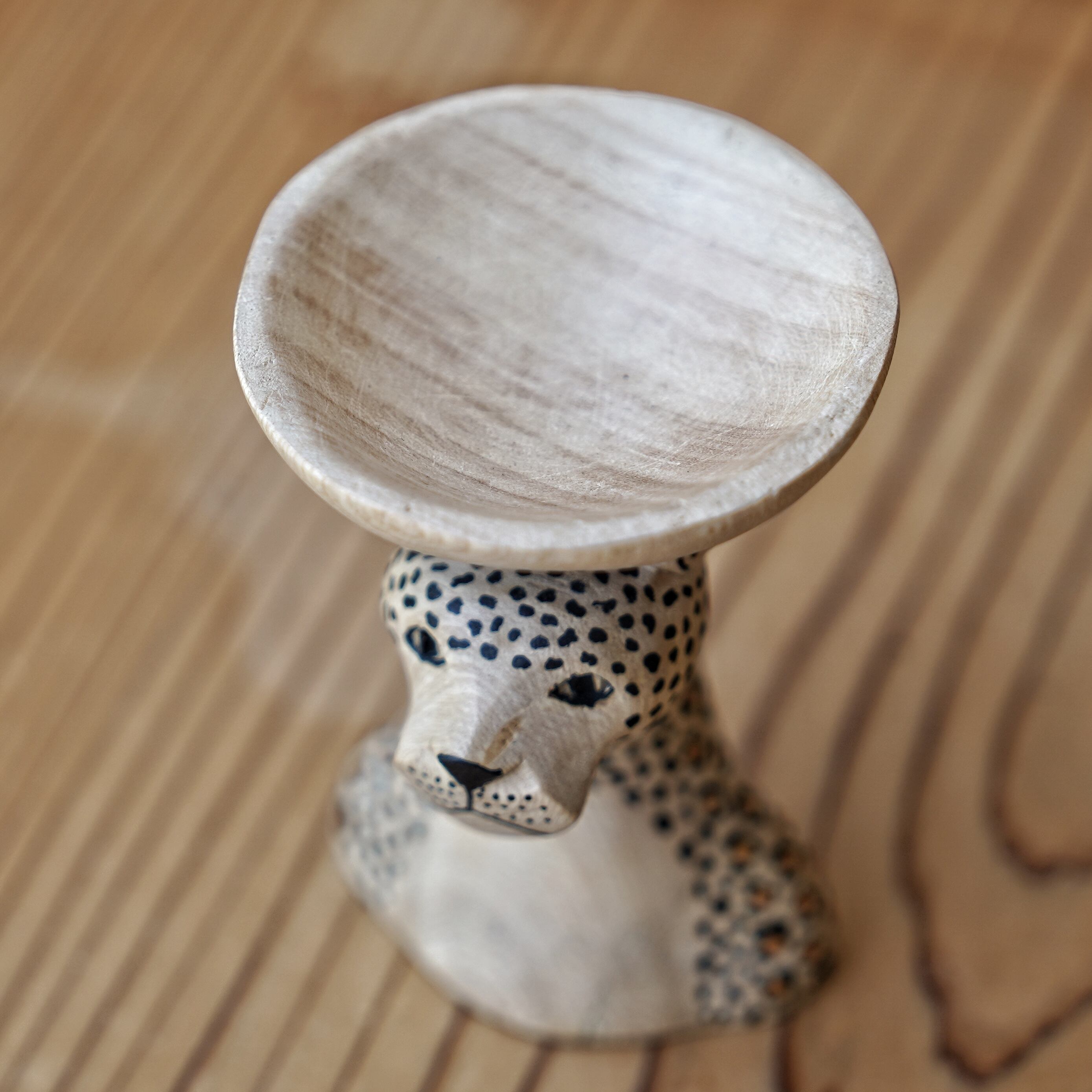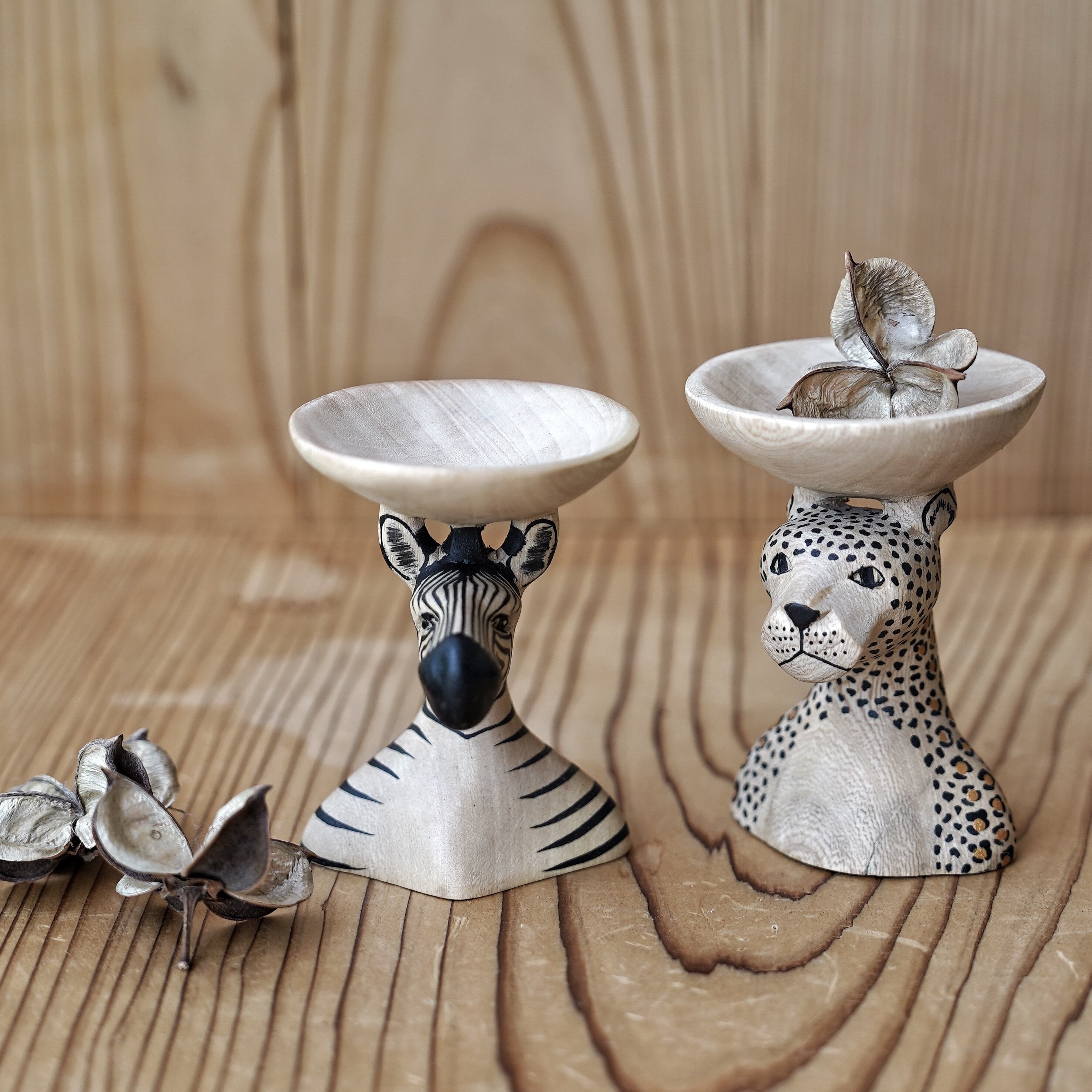 動物たちの頭にボウルを乗せた小皿タイプの木彫りのオブジェ。