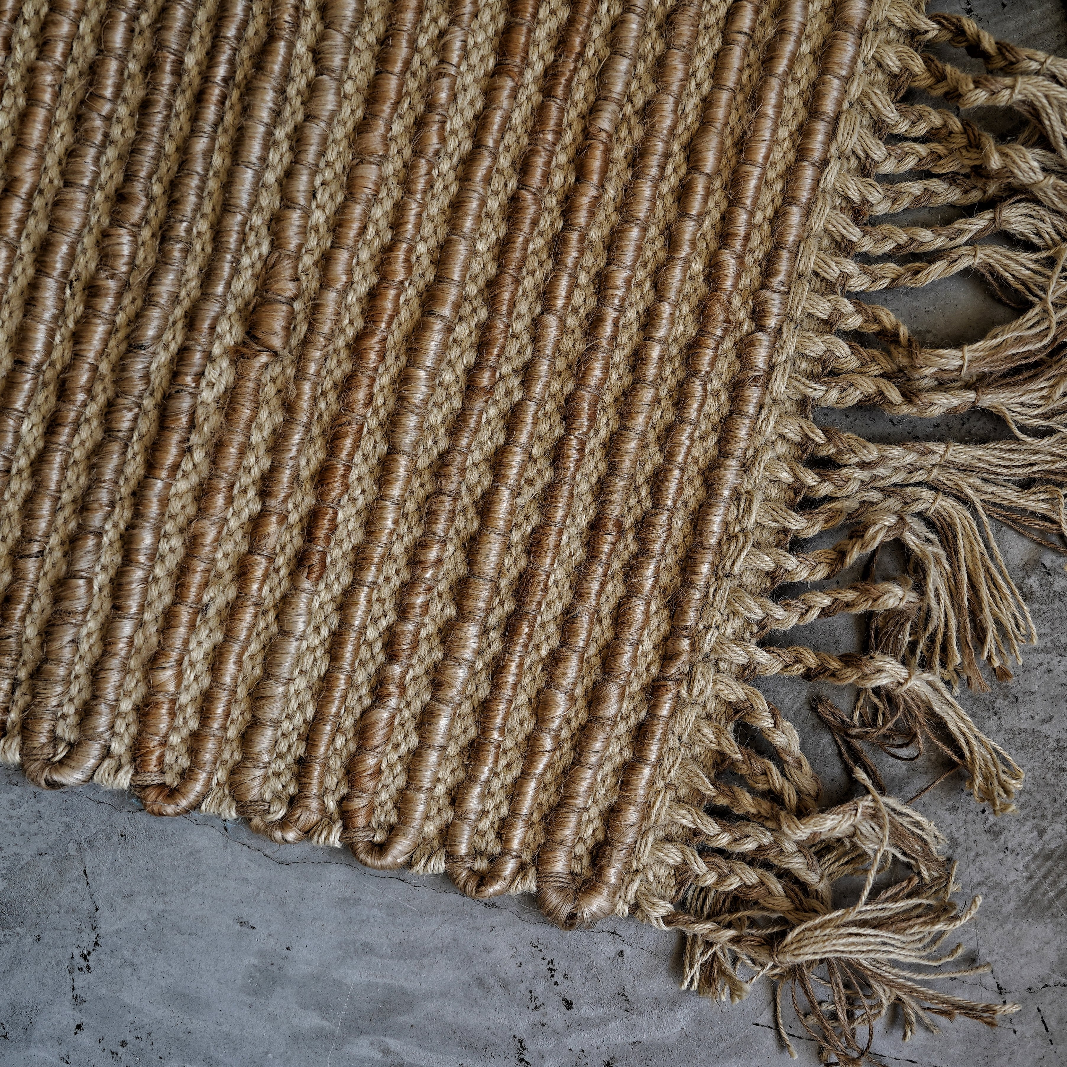 衣料にも使われているオオアサ(HEMP)のナチュラルな素材感が、あたたかみと涼しげな印象をあわせもつラグです。高い通気性を持ちながらも実は保温性にも優れているので、年間を通して快適に過ごせます。永くお使いいただける重厚感ある商品です。