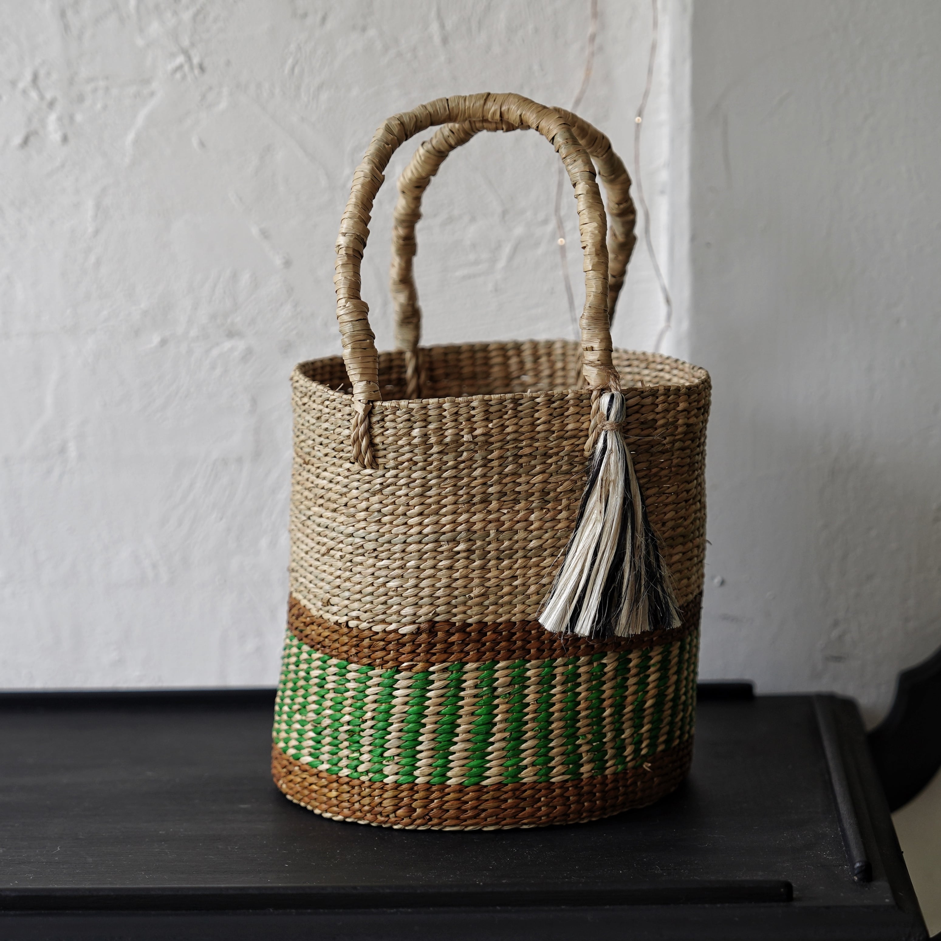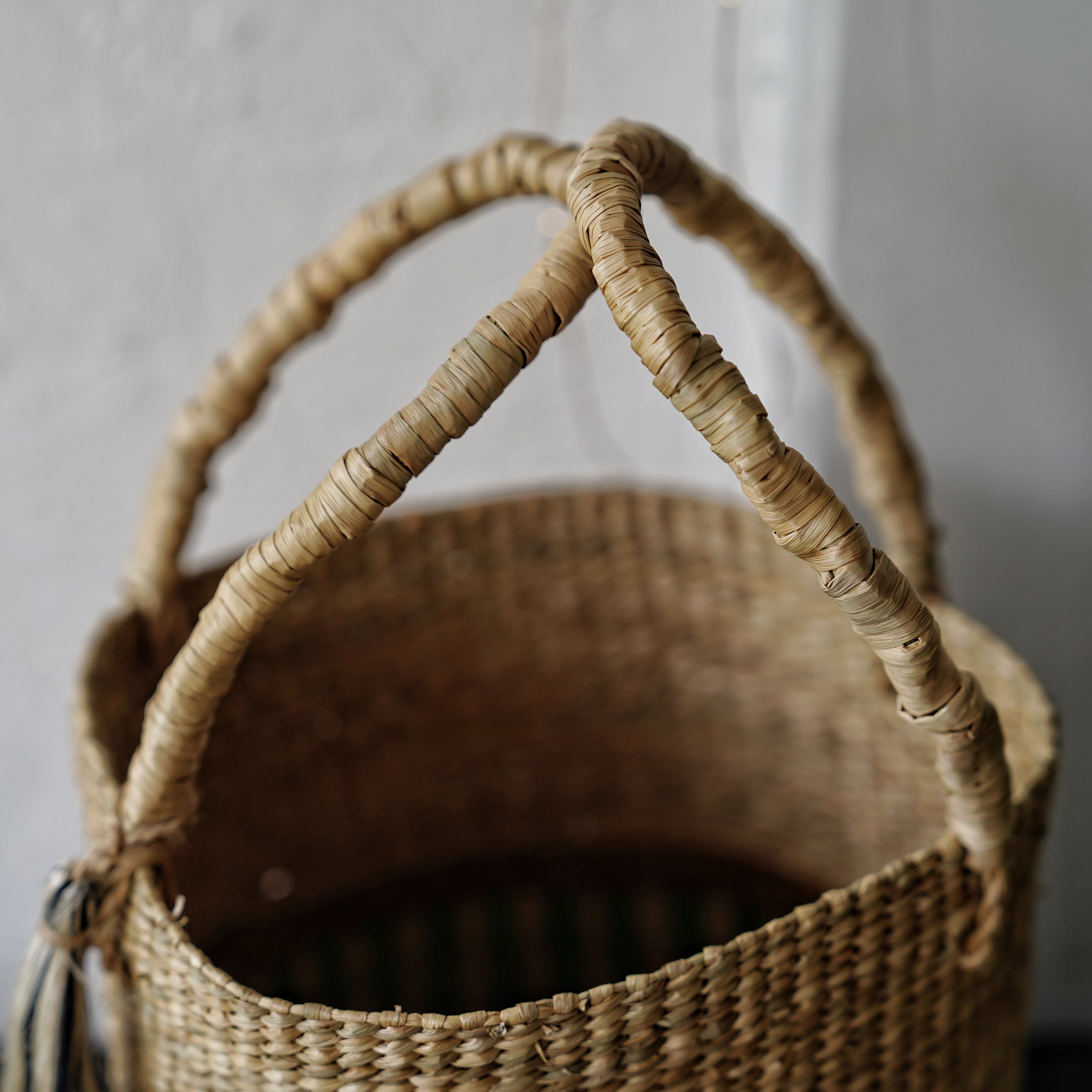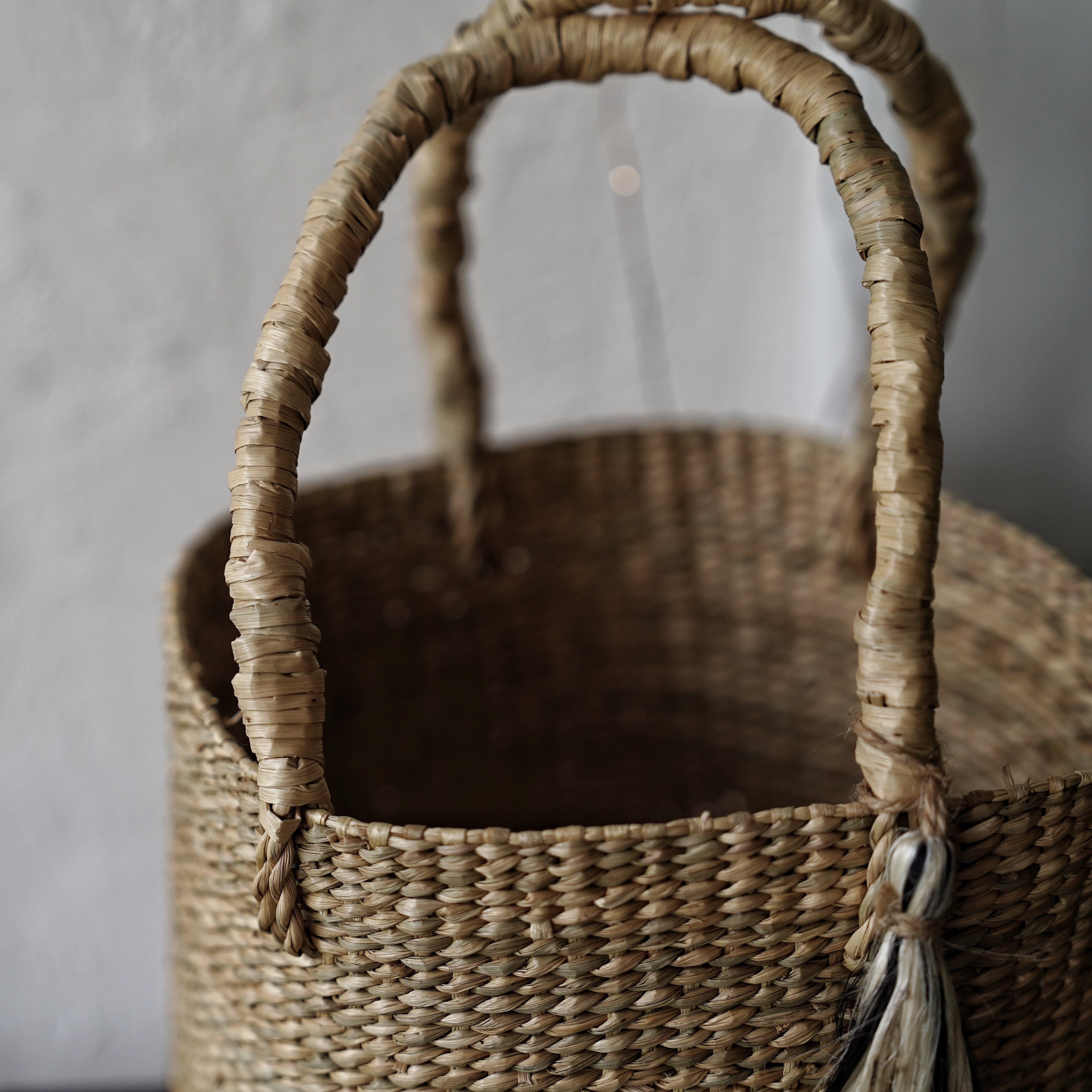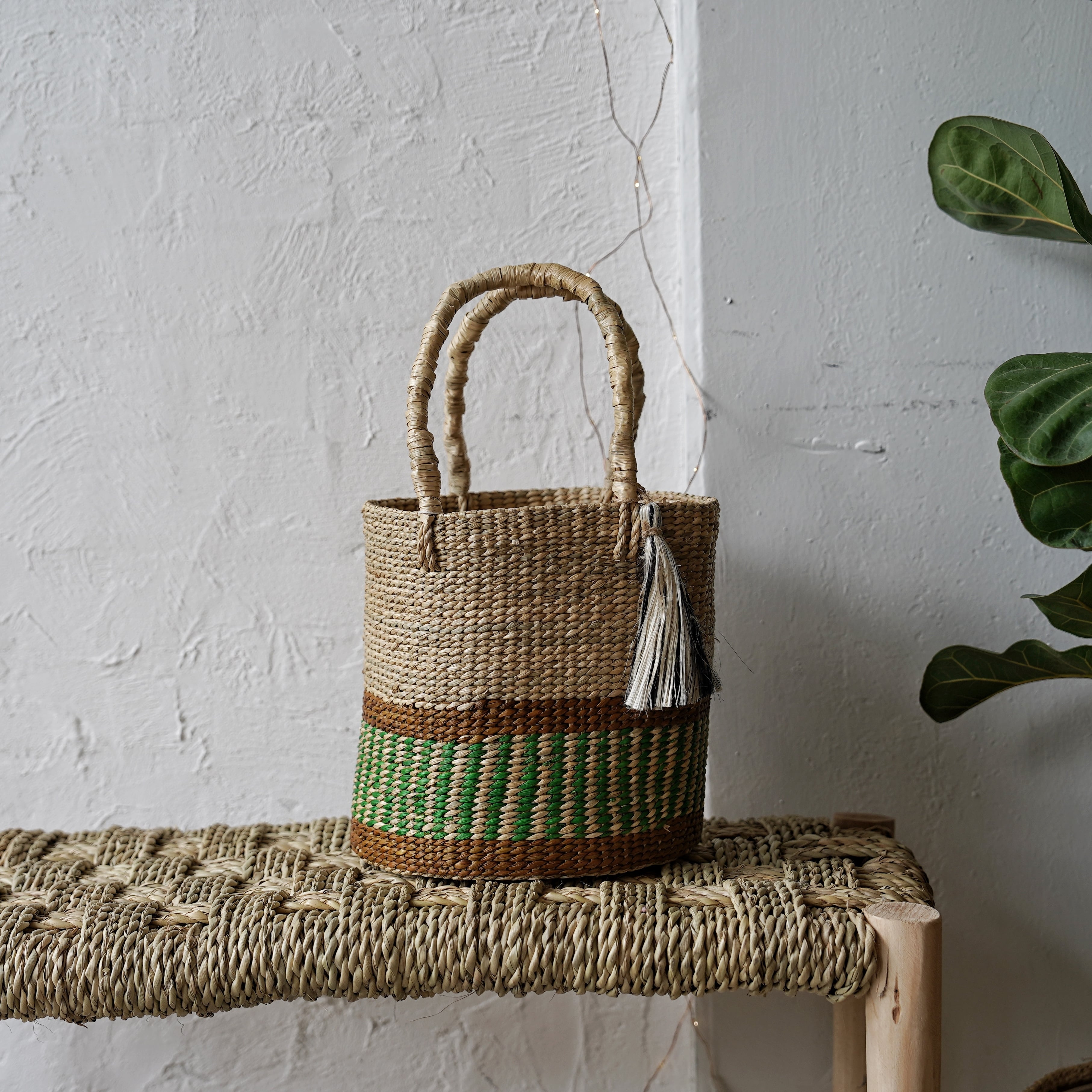 バングラデシュの湿地帯に自生するパティ草で手編みされた、しっかりとした丸底のかごバッグ。