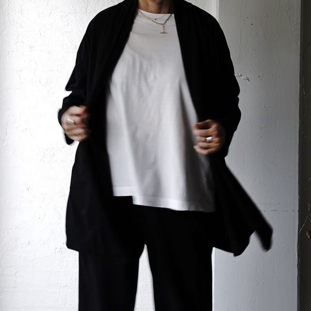 前下がりの裾のドレープが美しい、ボタンなしでさっと羽織れるロングカーデガン。