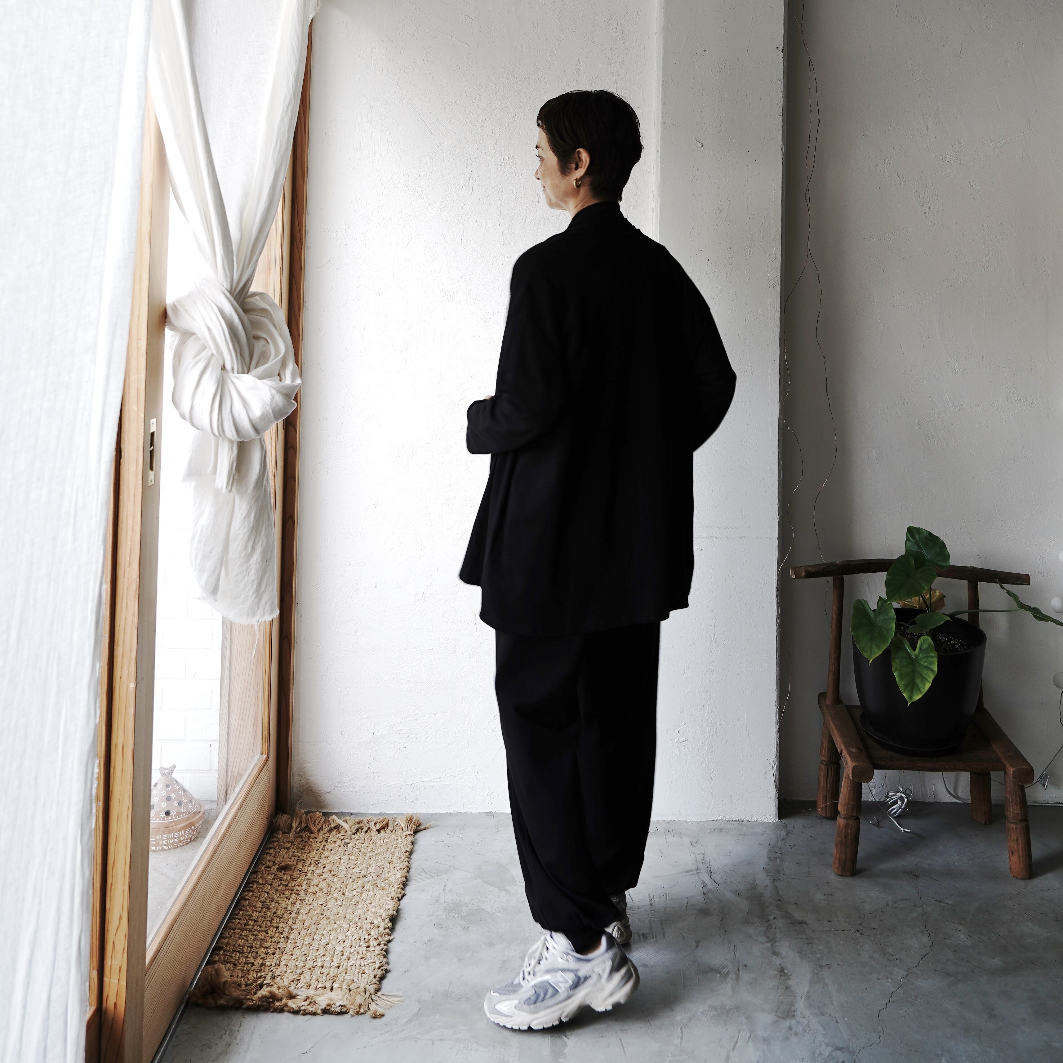 ショールカラーの襟元は日焼けや冷房の冷え対策に。