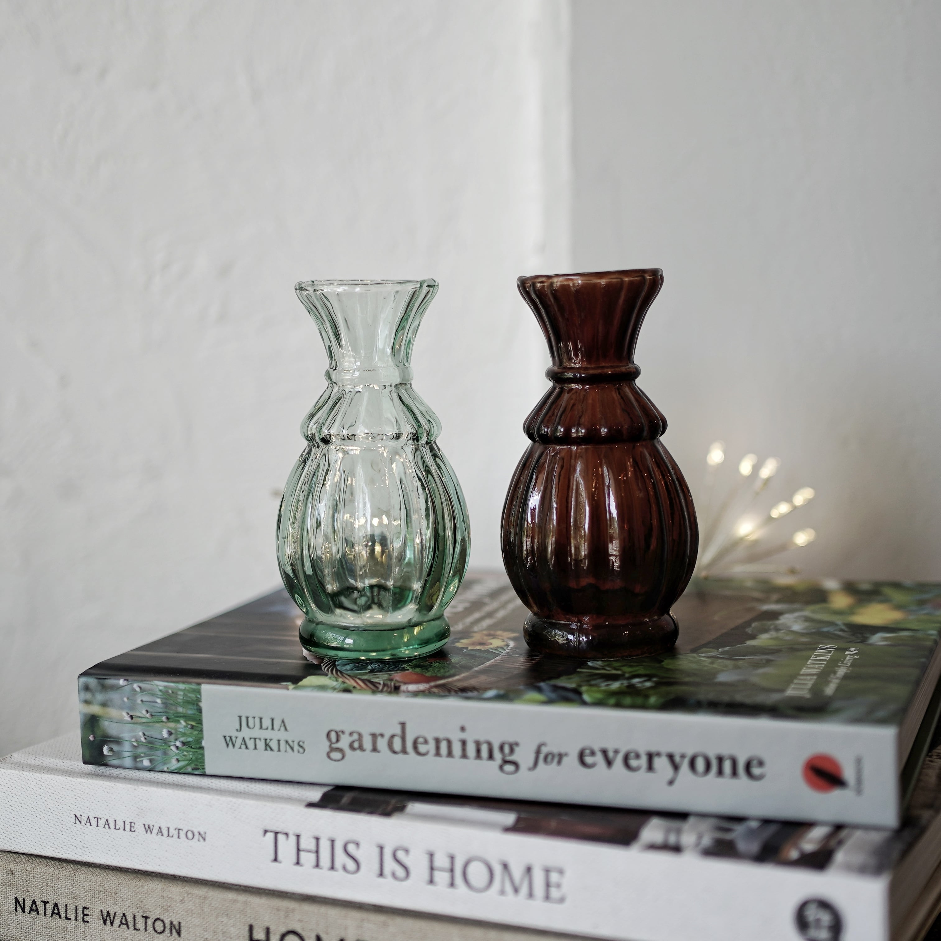 立体的なリブ模様がすっと縦に伸びる、どこかレトロでエレガントな佇まいのフラワーベース。