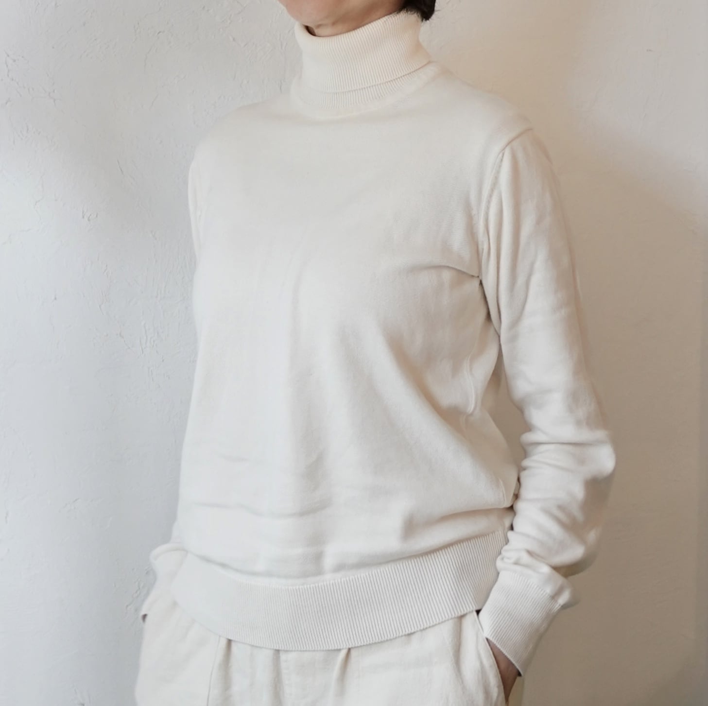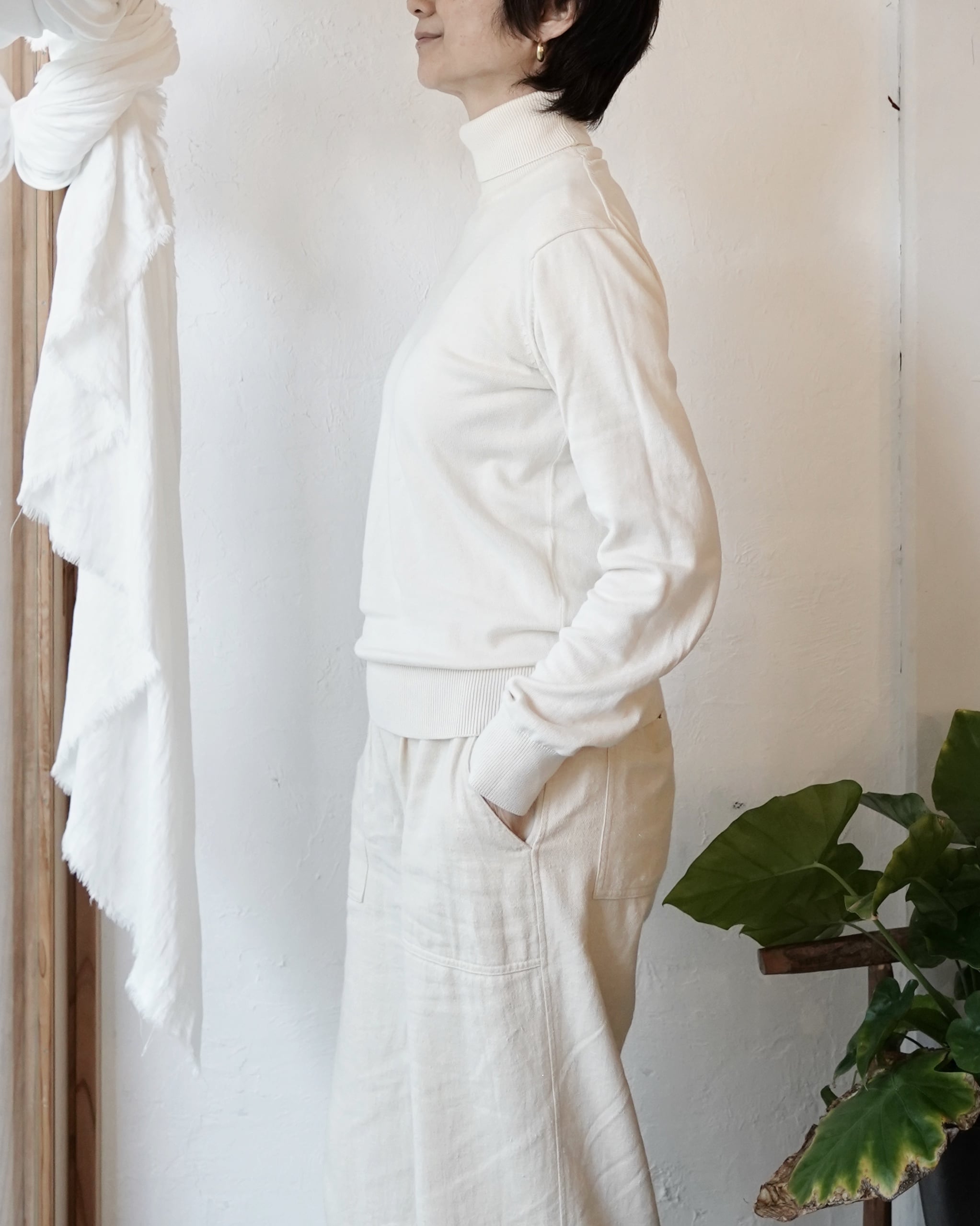 首もとをやさしく包み込むタートルネック。しっかり編まれた生地が、冬の冷たい空気を丁寧にシャットアウトしてくれます。やわらかなオーガニックコットンならではの“チクチクしない”肌ざわりは、素肌にそのままでも安心。