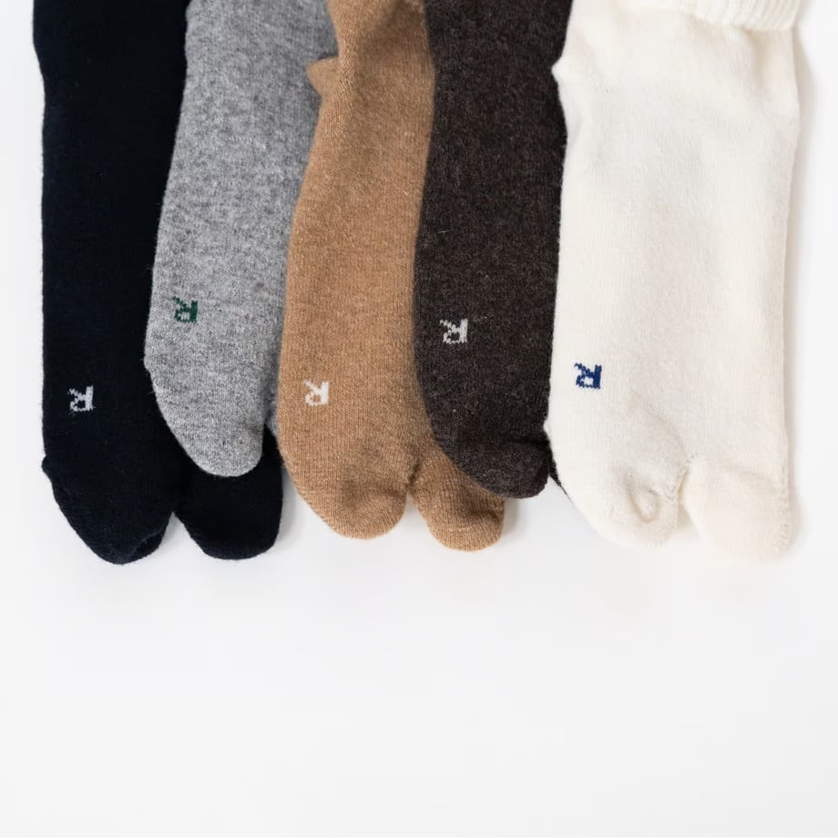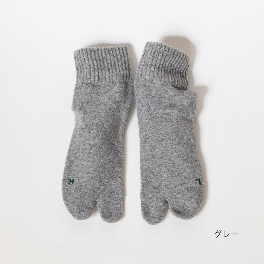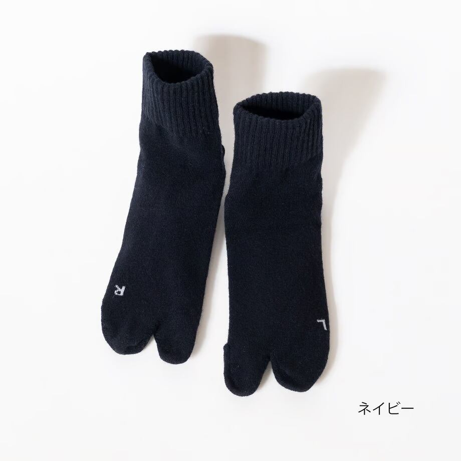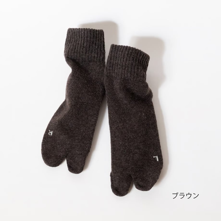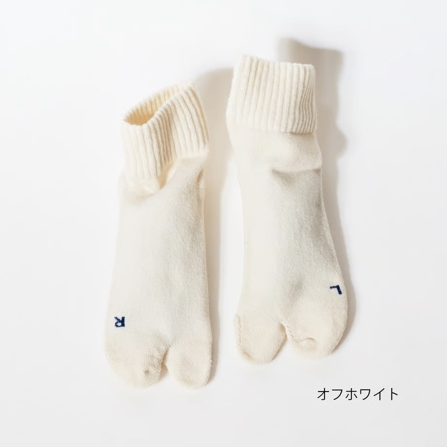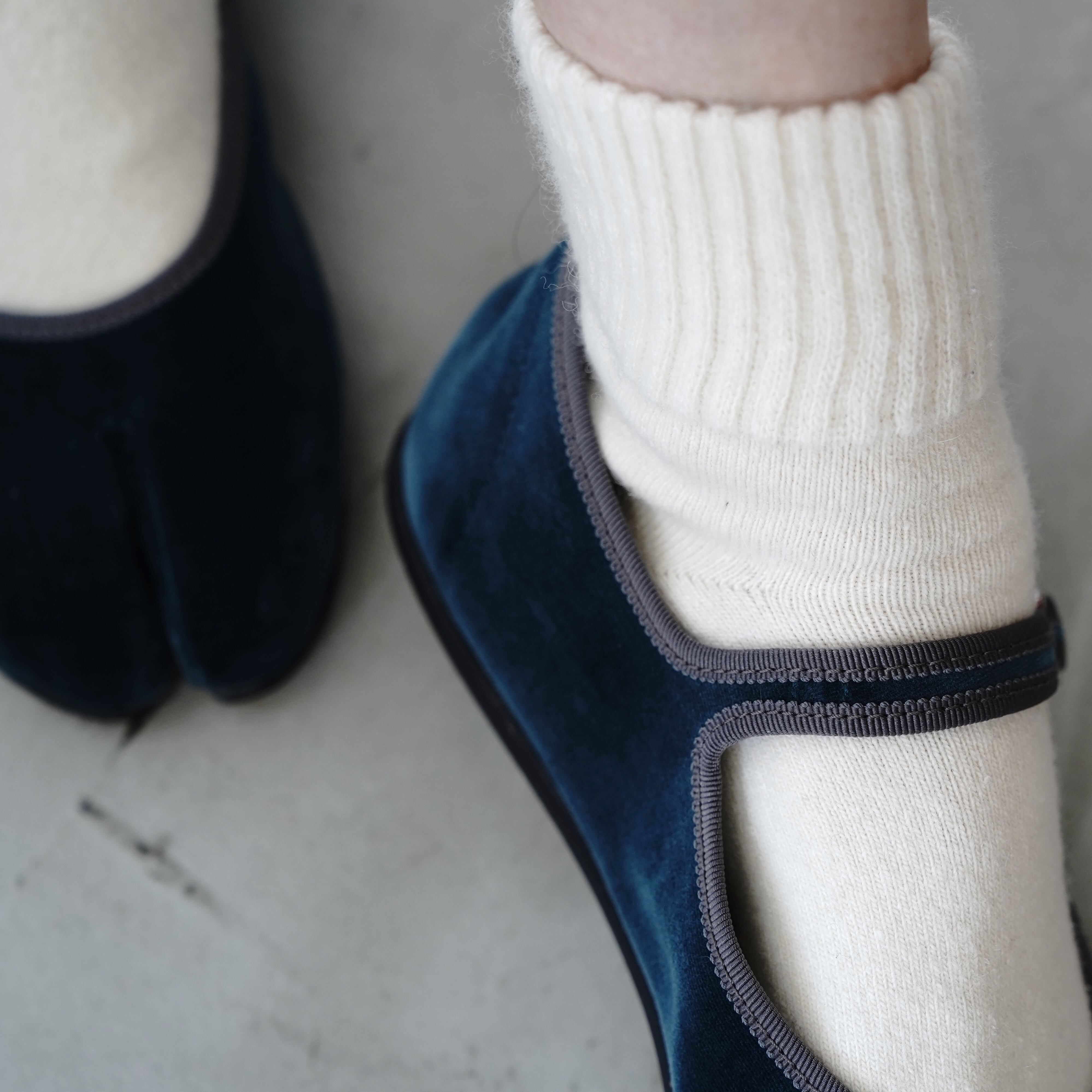 リサイクルウールをメイン素材に使用した平編みのタビ型ソックス。