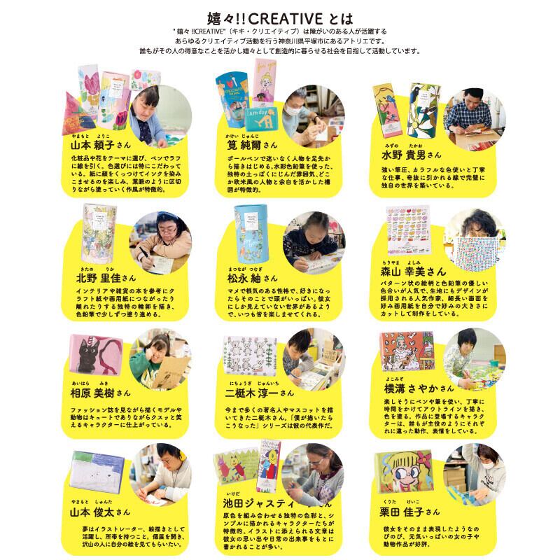 様々なハンディキャップを持つ人が好きなこと・得意なことで活躍し、 嬉々として創造的に暮らせる社会を目指して活動する福祉施設/アトリエ 「嬉々!! CREATIVE(キキ・クリエイティブ)」の個性的なアーティストたちが手がける、ポップでキュートな限定アートパッケージ『Artisanシリーズ』が、数量限定で登場!